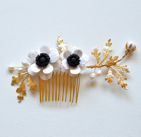 Lidia Hair Comb in Black and White Anemone and Oak Leaf Branches